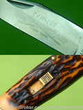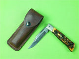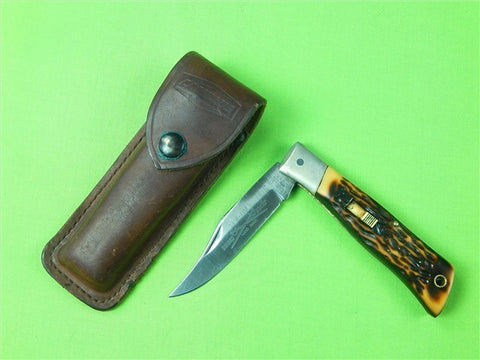 Camillus Cam-Lok Sword Brand Switch Blade Folding Pocket Knife with leather sheath. Broken, doesn't close. 8 3/8" long, 4 3/4" closed.